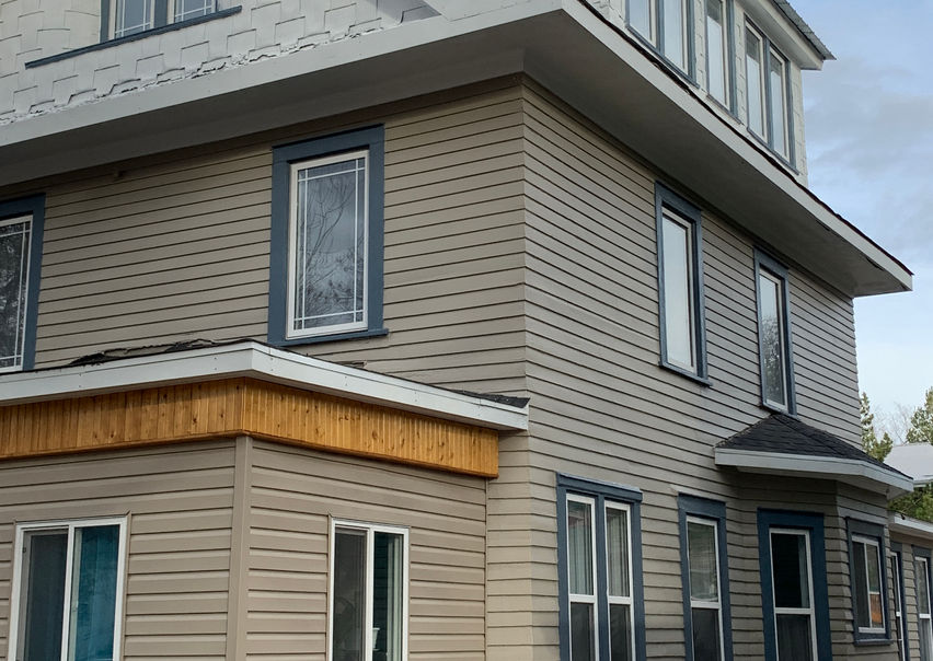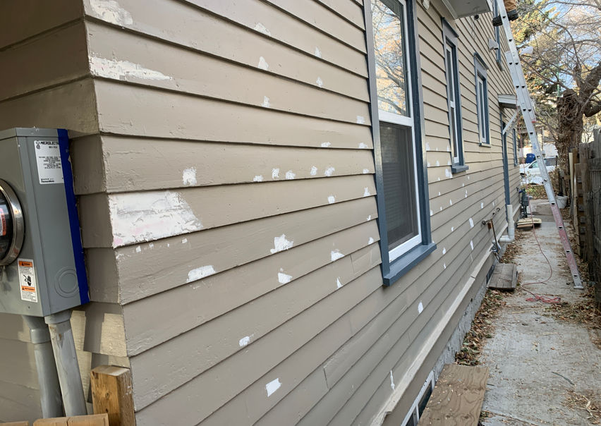 Older 2 1/2 story house on the south side. Full exterior repaint. The owner wanted to cover the green shingles so I primed them with an oil primer and then sprayed two coat exterior paint. We painted the old siding to match the new vinyl siding on the front of the house.
