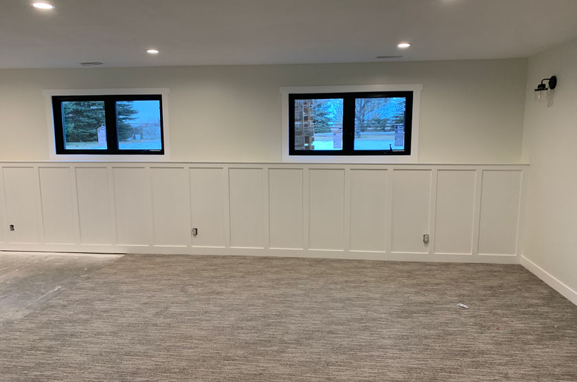 PORTER BASEMENT: VHL Construction did the renovation where they extended the family room, and added a new bedroom. They added wainscoting which had to prepped and painted. We primed and painted the walls eggshell and prepped and painted the trim, doors, and wainscoting with 2 coats semi-gloss. We also painted the ceilings 2 coats flat ceiling paint. On the other side of the basement we sprayed the wood siding that they installed. Which is why it's all covered with plastic and tape and papered.